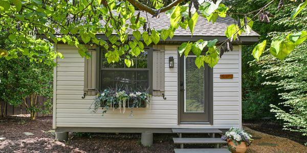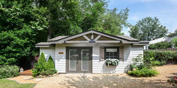 With vaulted ceilings and exposed beams, this 190 sq. ft. retreat offers a lounge, office nook, and Trex patio with market lighting. Paired with its private shed for organized outdoor storage, it’s ideal as a creative studio, reading hideaway, or wellness space.